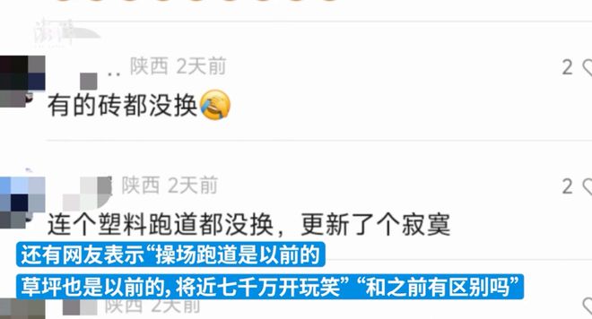据澎湃新闻报道,有网友称“连个塑料跑道都没换,更新了个寂寞”“期待的地下停车位在哪了,地上改造还是原来的旧样子”,还有网友表示,“操场跑道是以前的,草坪也是以前的,将近七千万开玩笑”“和之前有区别吗”。
