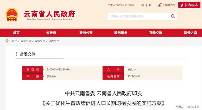 9月16日,云南省委、省政府印发《关于优化生育政策促进人口长期均衡发展的实施方案》明确,2023年1月1日至2025年12月31日,对新出生并户口登记在云南的二孩、三孩分别发放2000元、5000元的一次性生育补贴,并按年度发放800元育儿补助;对新出生并户口登记在云南的婴幼儿购买意外伤害险给予每人每年50元参保补贴。