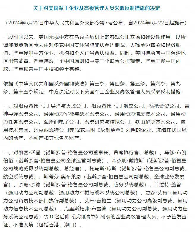 5月22日,外交部公布“中华人民共和国外交部令第7号”,即“关于对美国军工企业及高级管理人员采取反制措施的决定”。