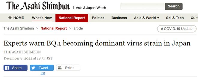 《朝日新闻》在12月8日发布的报道中援引日本卫生部新型冠状病毒专家小组成员的意见称,尽管BQ.1可能更容易传播,但受感染的病人出现重症的风险与感染BA.5毒株的病人的风险基本相同。