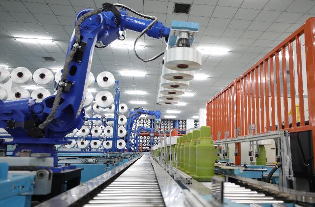 3月15日,在恒力(苏州)产业园内的高性能涤纶工业丝智能车间内,机械手臂将检验合格的丝饼放上丝车,转运至智能立体仓库。新华社图