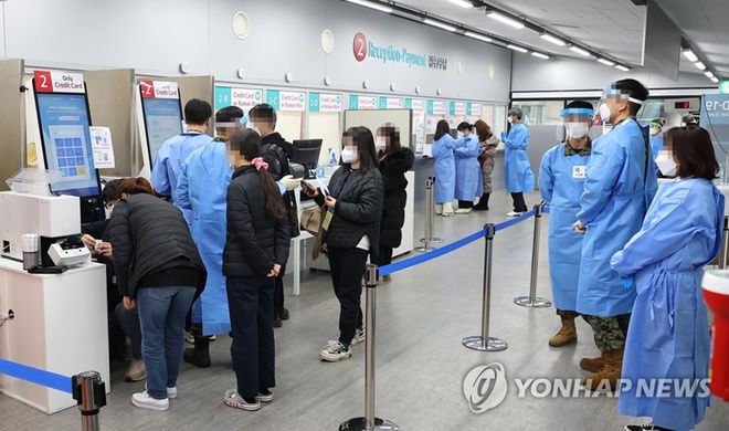 1月5日,在仁川国际机场新冠检测中心,自华入境人员准备接受检测,可清晰地看到入境者佩戴的黄色标识 图:韩联社