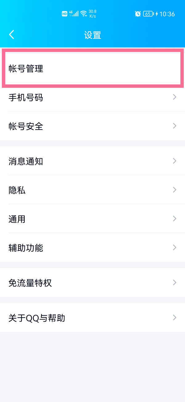 1、点击右上角QQ头像,点击设置后选择【帐号管理】。