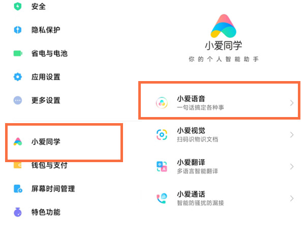 1、打开手机设置,点击小爱同学,再点击小爱语音。