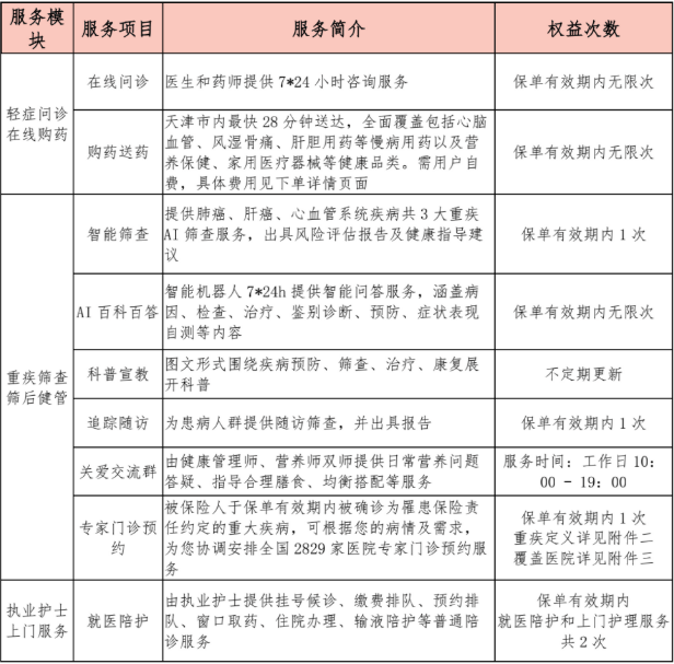 天津惠民保健康服务是为天津惠民保参保客户提供的专属健康服务,所提供的增值健康服务包含“轻症问诊在线购药”、“重症筛查筛后健管”、“执业护士上门服务”3类服务模块,具有“在线问诊”、“购药送药”、“智能筛查”、“AI百科百答”、“科普宣传”、“追踪随访”、“关爱交流群”、“专家们门诊预约”、“就医陪护”和“上门护理”10项服务项目。