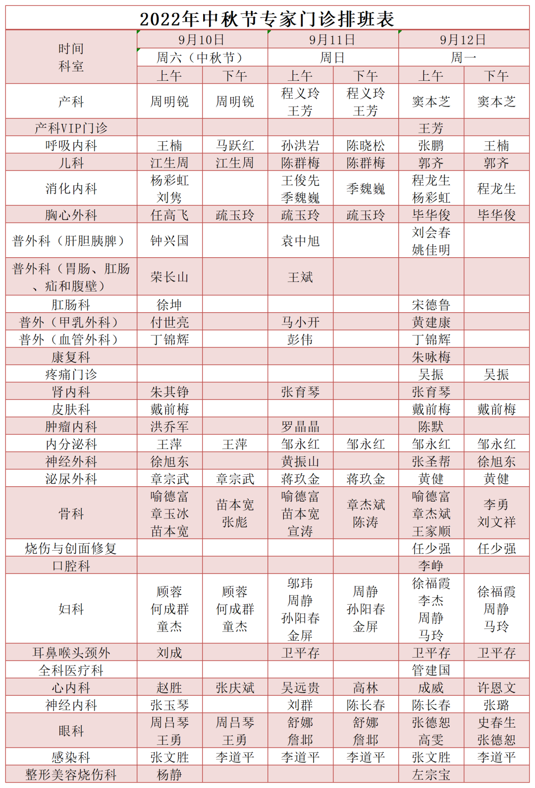 一、中秋节期间普通门诊及医技排班可在医院官网首页查询。门诊实行实名制预约挂号制度,请您按照预约时间来院,错峰就诊。请减少陪同人员,陪同人员非必要不进入门诊。