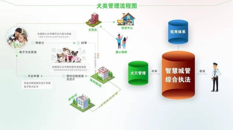 市民登录温州养犬公众号,将养犬条例要求的信息上传至系统,养管办后台审核通过后(最多10个工作日完成审核),在公众号预约登记点,随后犬主人携带犬只到登记点植入疫苗和芯片,植入后等待观察一段时间,犬主人手机就会收到信息自己爱犬的“身份证”,现场给爱犬带上犬牌,完成了全部登记流程。