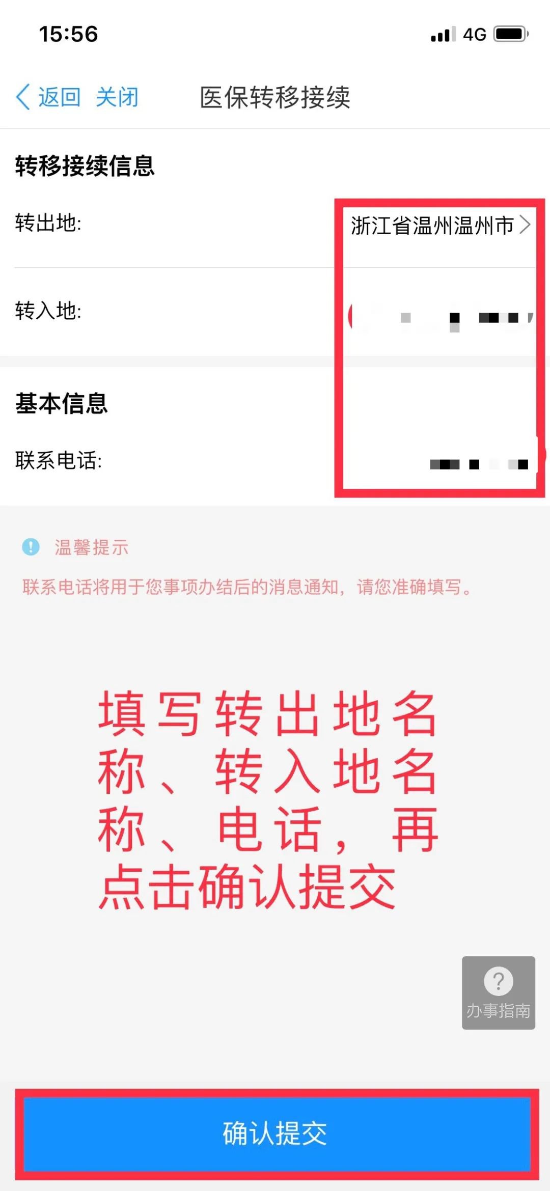 操作步骤:点击医保转接——填写转出地名称、转入地名称、联系电话——点击确认提交。