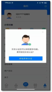 (1)用户完成登录后,提示用户进行实名认证。点击前往认证进入实名认证流程。