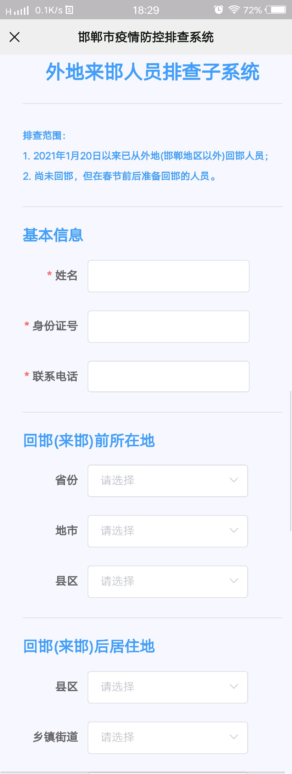 加强外地来邯返邯人员排查防控,是严防疫情输入的重中之重。为有效精准掌握春节前后拟来邯返邯和近期已来邯返邯人员情况,全面助力疫情防控工作,根据《关于进一步加强外来人员排查管控工作的通知》(邯防领办〔2021〕86号)要求,全市所有来邯返邯人员,均要通过扫码进入“外地来邯人员排查子系统”进行填报登记。