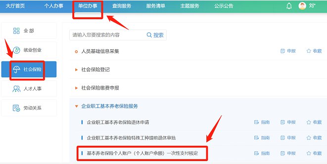(四)选择“单位办事”——“社会保险”——“基本养老保险个人账户余额一次性支付核定”