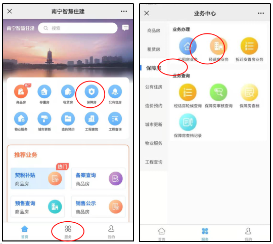 1. 点击“保障房”或者“服务”菜单,进入“业务中心”页面,选择“公租房业务”。