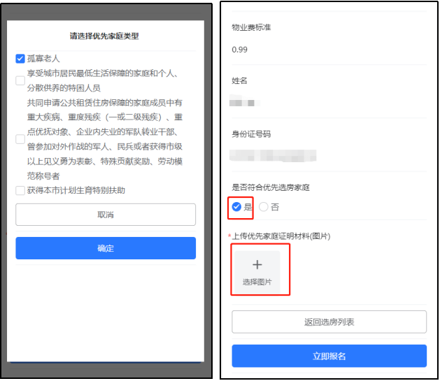 5. 如果是优先家庭报名,在确认报名页面中,选择符合优先家庭并上传相关证明材料进行报名即可。