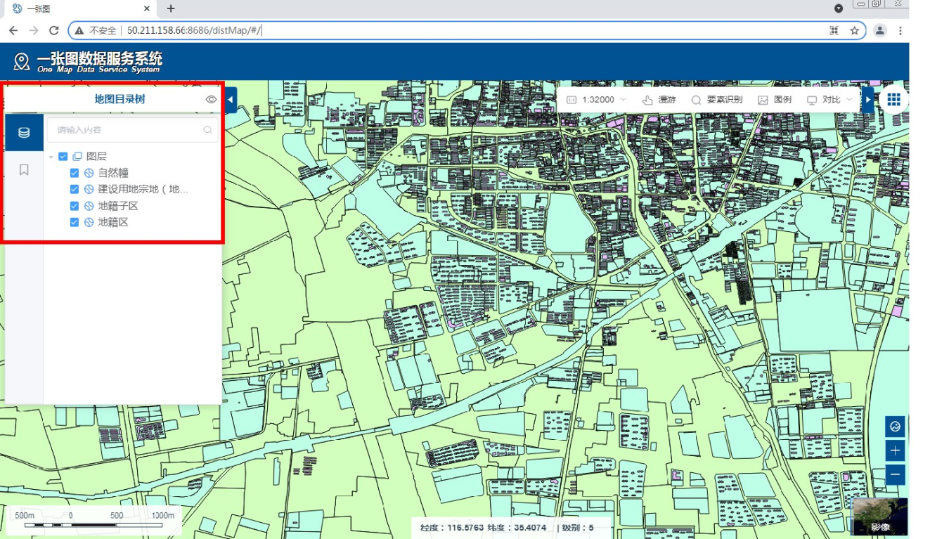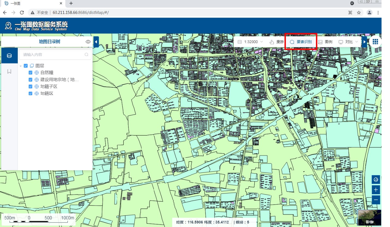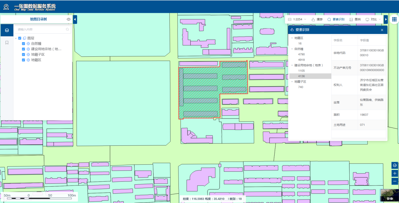 1.进入宗地查询界面后,在界面左侧工具栏通过“地图目录树”选择查询条目,然后点击界面右上方“要素识别”,在地图指定位置可以查看具体的宗地信息。