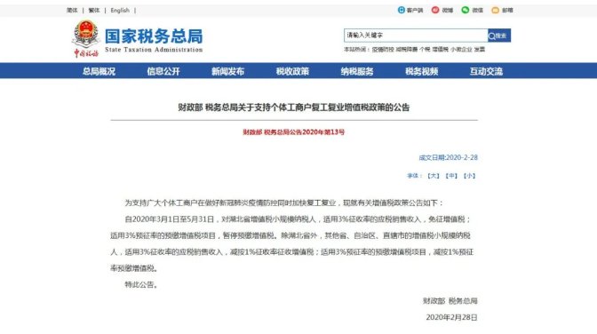 为进一步支持广大个体工商户和小微企业全面复工复业,现将有关税收政策公告如下:《财政部 税务总局关于支持个体工商户复工复业增值税政策的公告》(财政部 税务总局公告2020年第13号)规定的税收优惠政策实施期限延长到2020年12月31日。