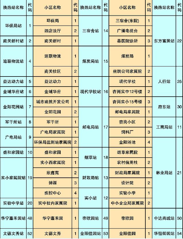 编码规则为12位数字编码,依次由换热站代码(2位数字见下表)+小区代码(2位数字见下表)+楼号(2位,1号楼即01)+单元号(2位,2单元即02)+房间号(4位,301室即0301)组成,其中平房楼号为00,平房排序替代单元号。如华宁站下华宁小区1号楼2单元301住户查询代码得知业主证件号为40 01 0102 0301(输入此号码查询时不包含空格)。