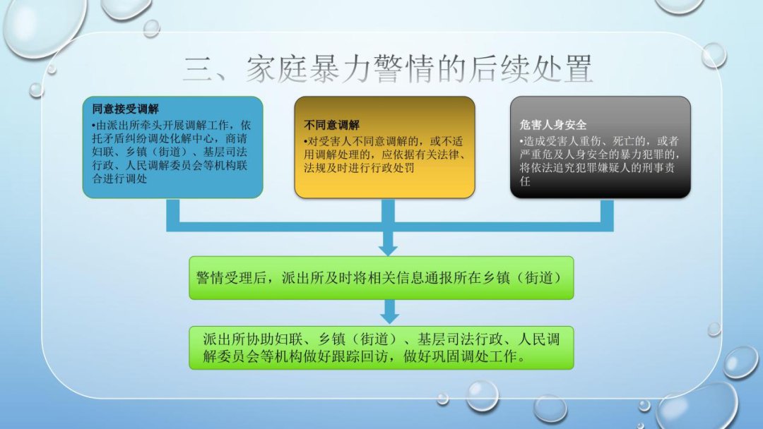 从快速处警、控制加害人、调查取证、组织救治、分级处理、自诉协助、提供救助、后续流转等环节,对家暴警情处置的全流程进行了细化明确,使出警民警有章可循、规范操作。