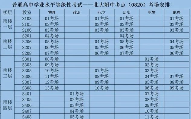 15. 北大附中考点的考场在南楼,考场安排如下: