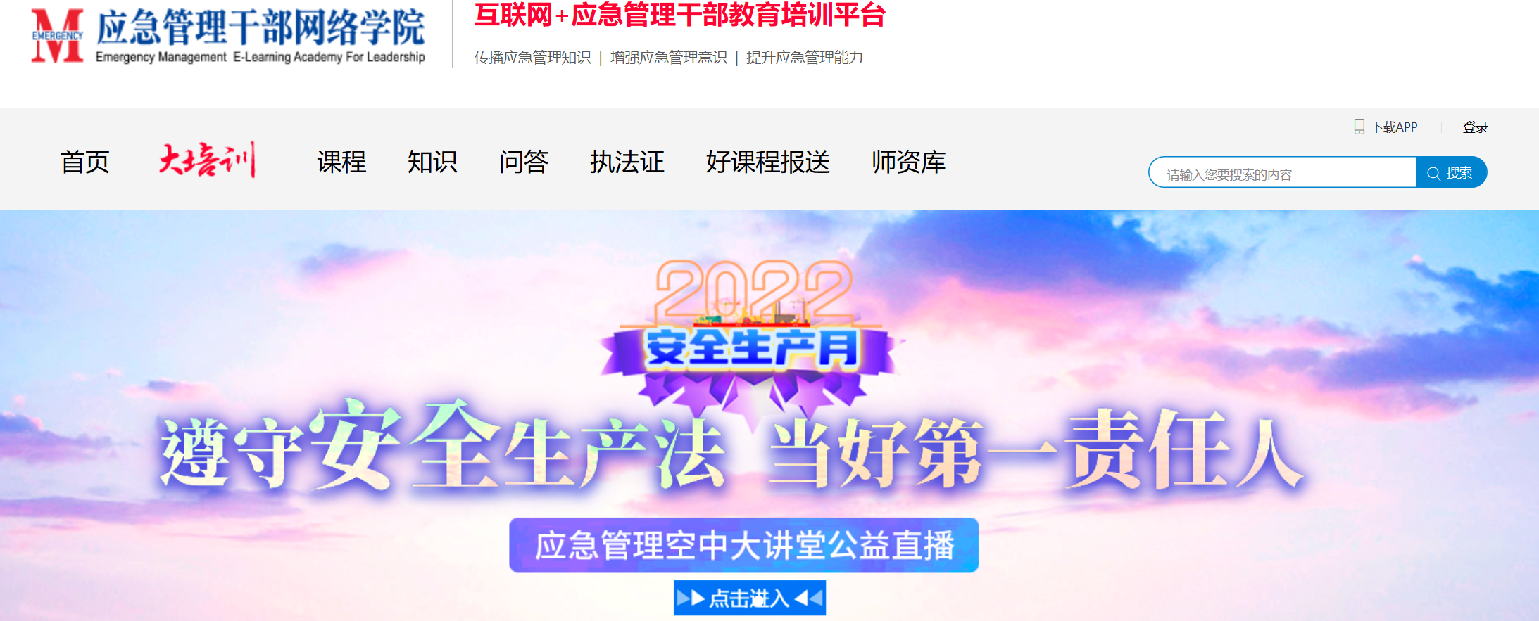 围绕2022年全国“安全生产月”活动主题,应急管理部干部培训学院(应急管理部党校)策划开展“应急管理空中大讲堂”系列公益直播活动,免费供各类人员和企业培训学习使用。