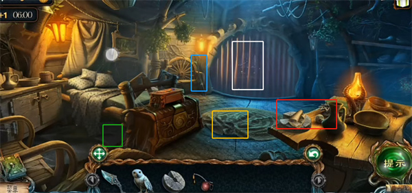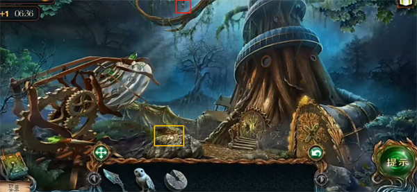 黄圈点击得到树枝,绿圈点击使用树枝可以赶走乌鸦,得到猫头鹰;
