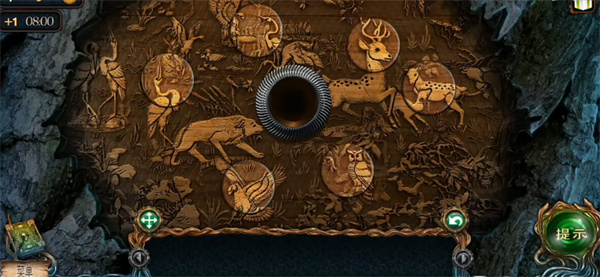 黄圈点击剥开树皮放入三个木雕,小游戏;