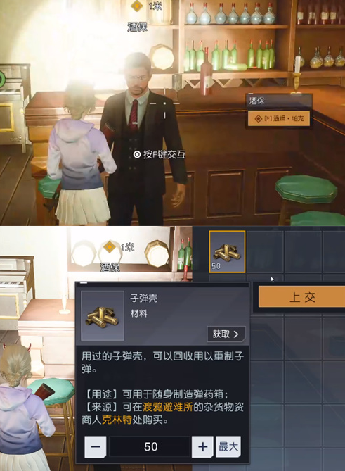 2、我们进入酒馆和NPC酒保对话,把50枚子弹壳给酒保。