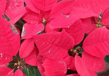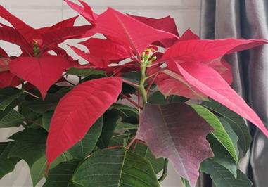 一品红的花语是我的心正在燃烧。这种花原产于中美洲,乍一看有着硕大的花瓣,但其实那是它的苞叶。苞叶长在顶端,颜色鲜红,就像燃烧起来一样。由于它的观赏季节在冬季,因此也可以作为圣诞花卉,尤其是红白搭配,别有一番风味。